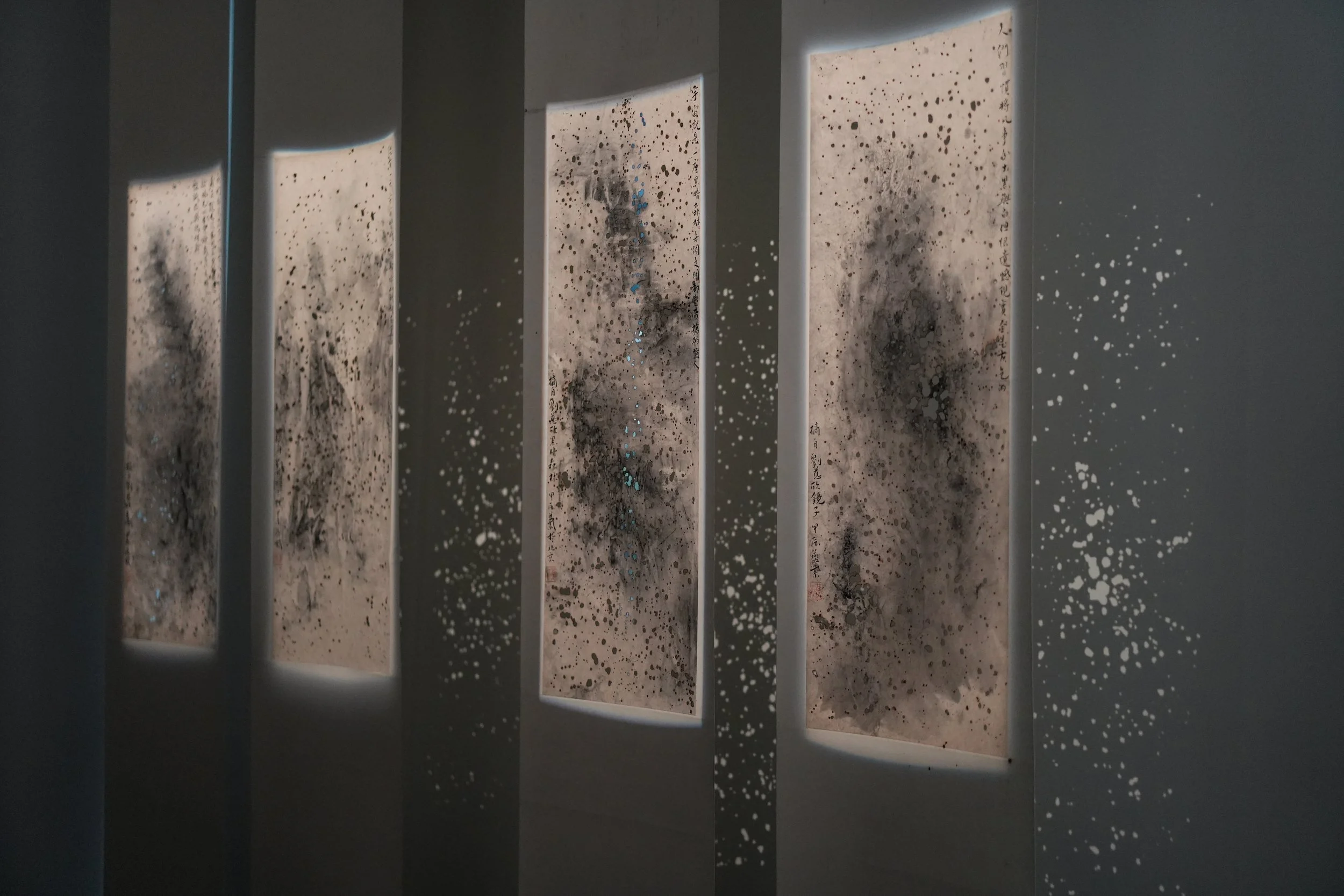 Based on previous understandings of Luo Min’s work, one might expect a similar quiet austerity. Instead, what emerges this time is a bright and agile self-awareness. Her Scenes Near Cloud Village dismantles the traditional framework of Chinese landscape painting through collage, connecting external and internal time with her brush. The result is a vivid and unordered world of ink and color that bridges East and West in her own way. The same dialogue between tradition and modernity unfolds in the collaborative video installation by photographer Alain Julien, artist Luo Yongjin, and digital media artist Yu Tian. Together they bring a constantly shifting narrative process in motion into a closed space, leading viewers into an immersive realm of abstract memory.